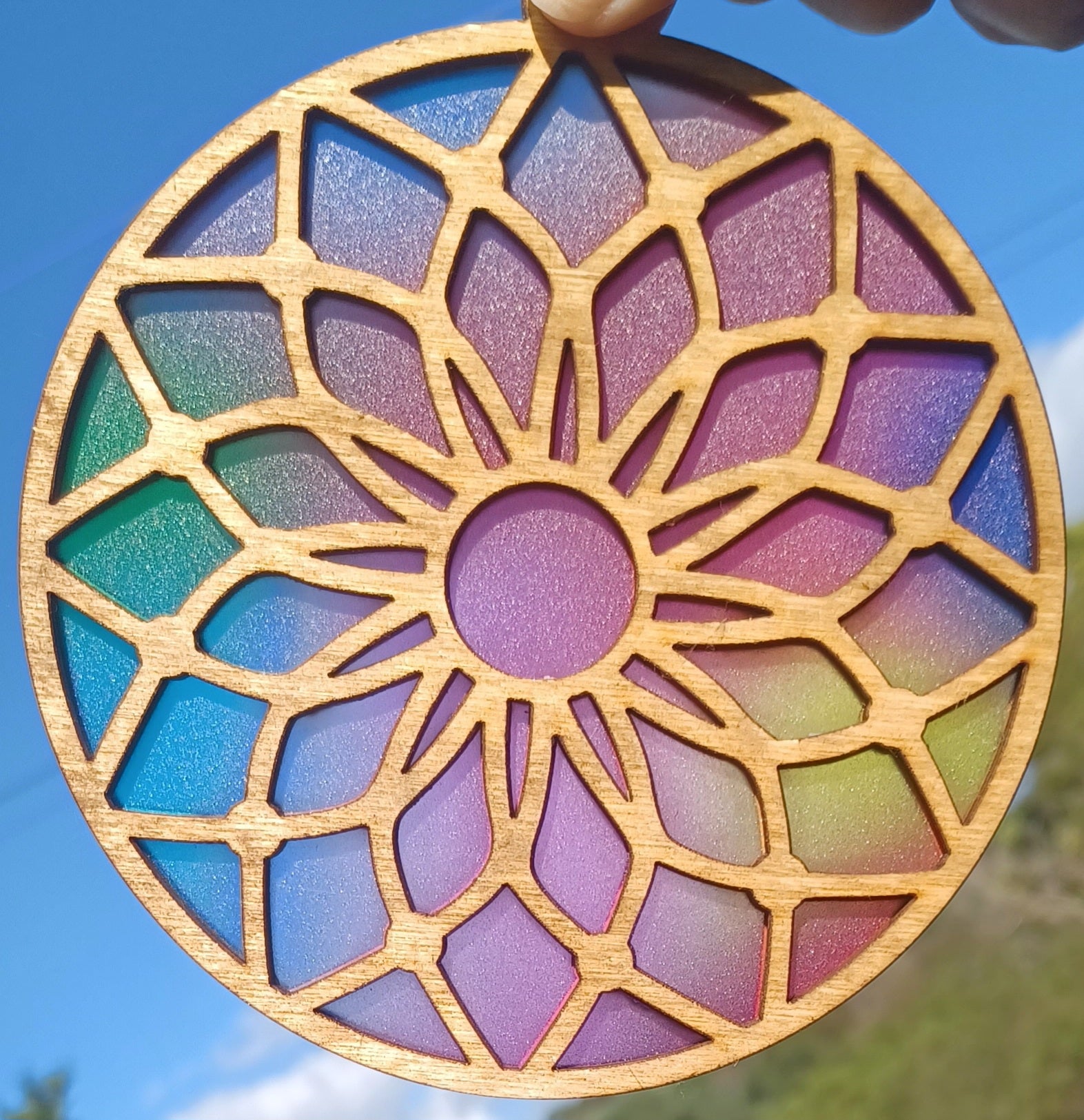 Elevate your space with our stunning Mandala Suncatcher. The intricate design and choice of black or stained frame will add a touch of elegance to any room. Enjoy the calming reflections of light as it shines through this eye-catching piece.
